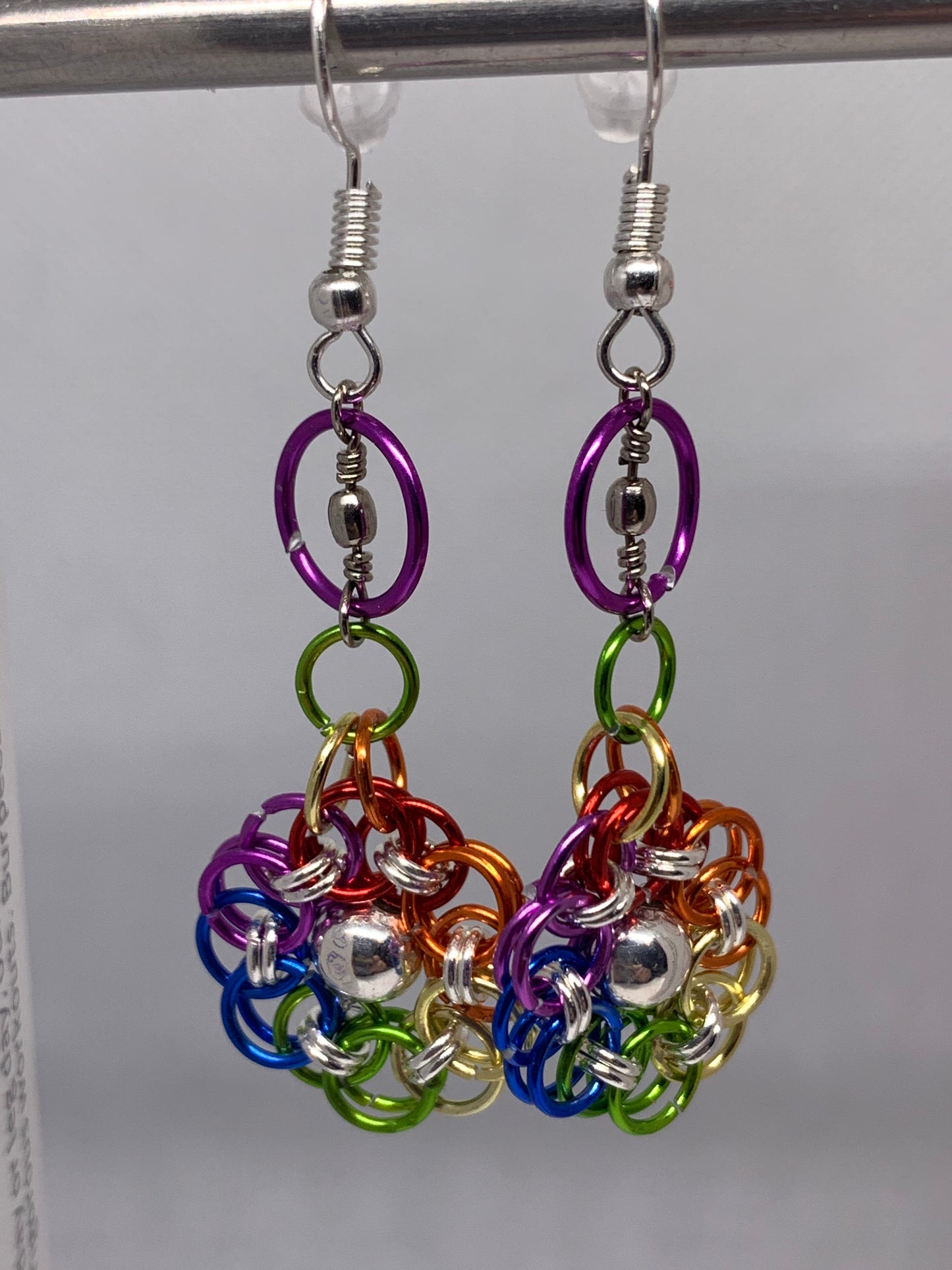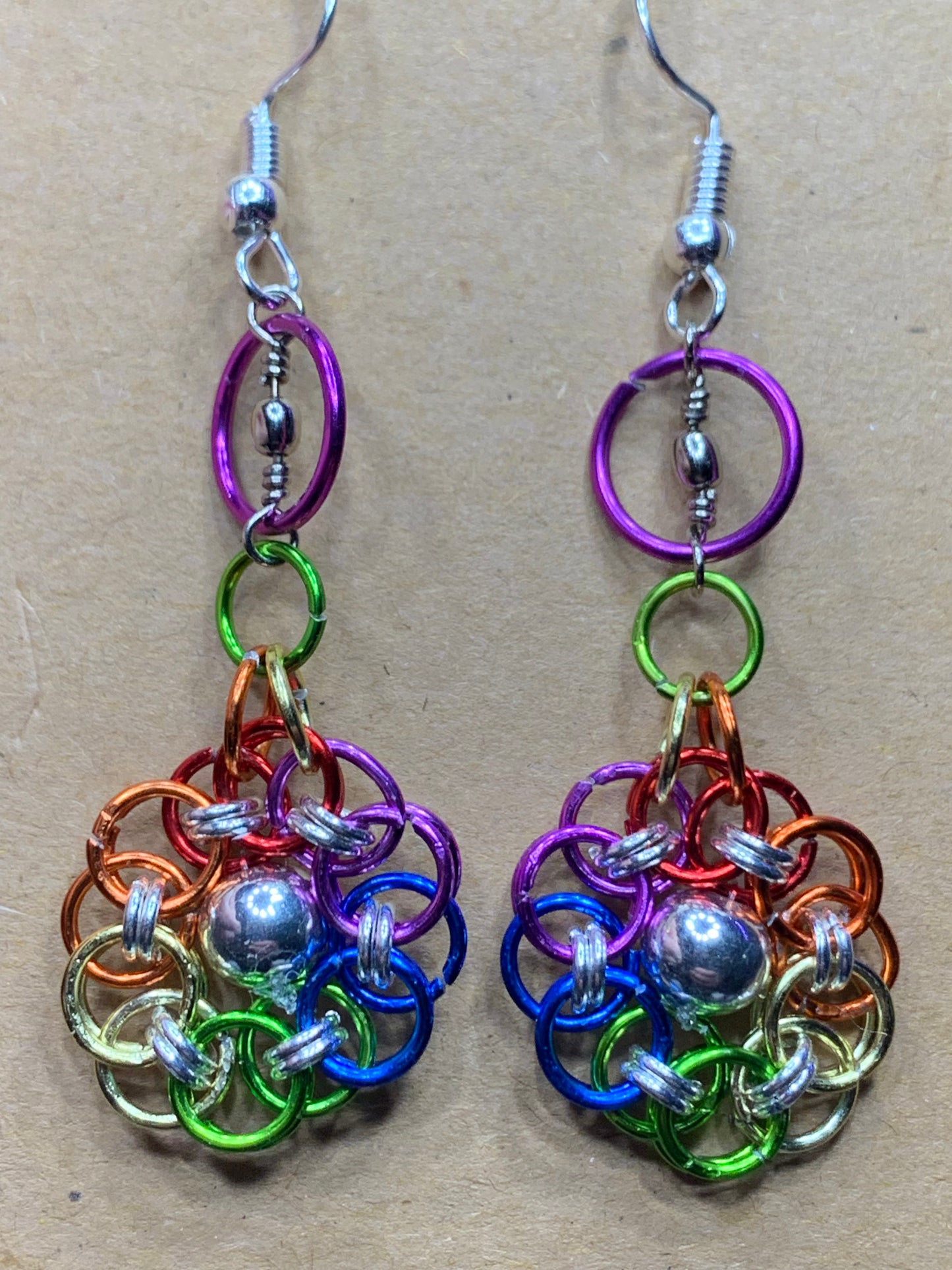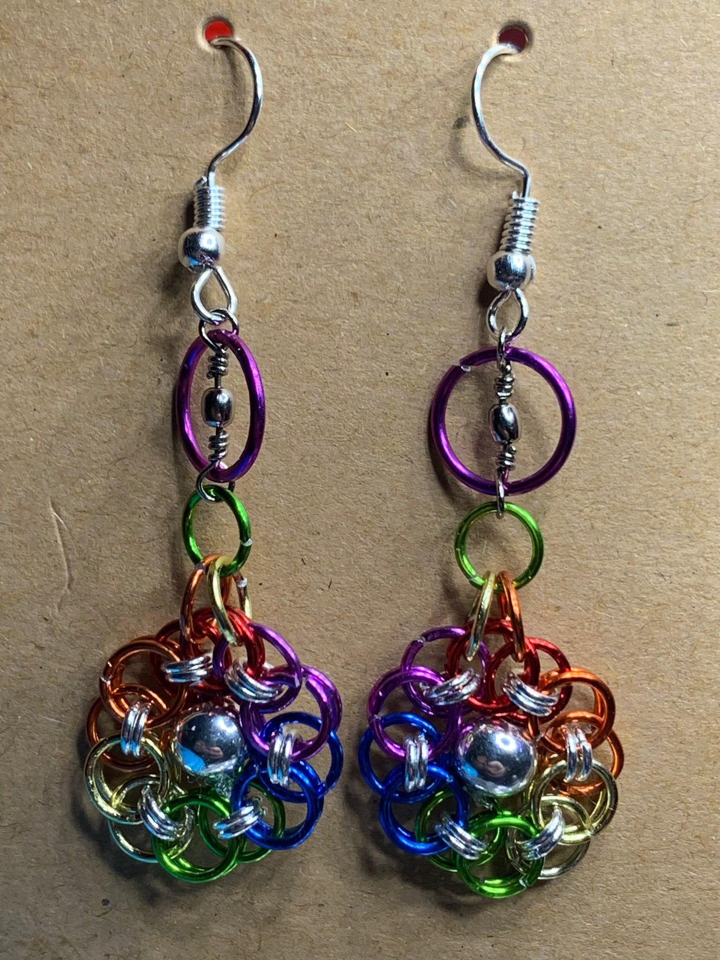 Daisy flower made from chainmail with a metal bead. Stainless steel stud or SS Fishhook by request, anodized aluminum rings.